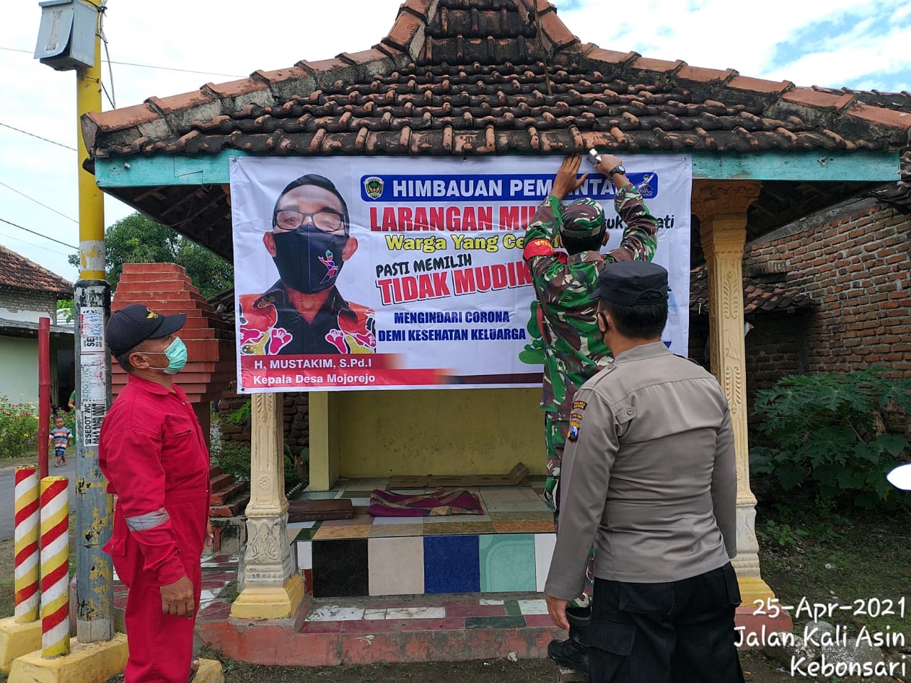 “Upaya pemasangan banner larangan mudik ini kami lakukan untuk mencegah dan mengendalikan penyebaran virus covid-19 di wilayah binaan kami, “ungkap Serda Yudi Riyawan Babinsa Desa Mojorejo.