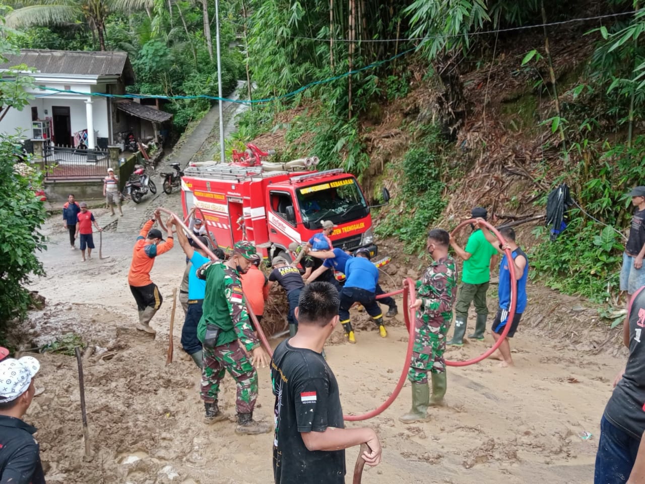 ANGKET24.ID, TRENGGALEK – Hujan deras yang mengguyur wilayah Kecamatan Watulimo pada hari Selasa (9/2/21) pukul 17.00, mengakibatkan bencana tanah longsor di RT. 09/02 Dusun Glati Desa Pakel Kecamatan Watulimo Kabupaten Trenggalek.