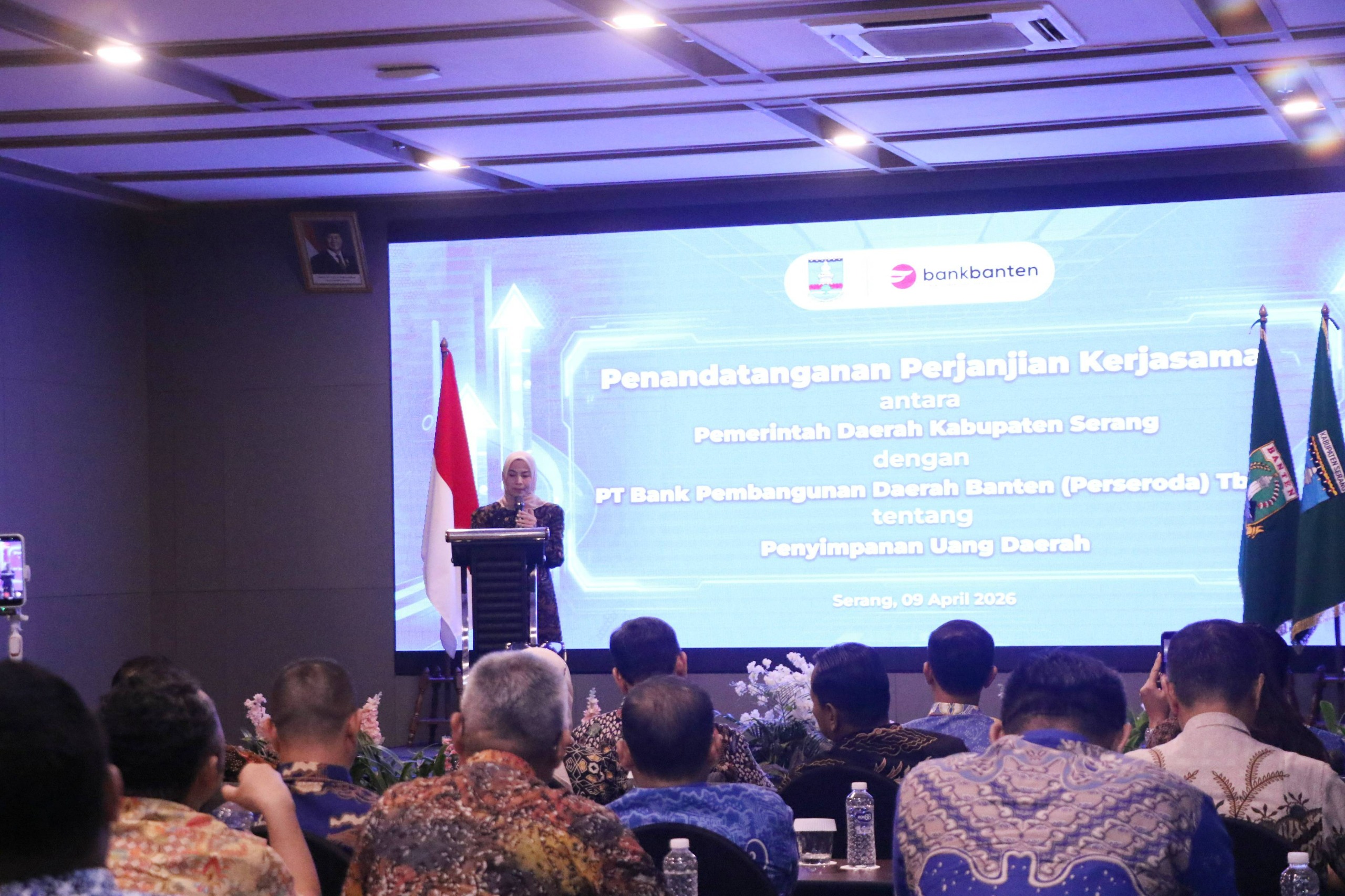 Penandatanganan dilakukan oleh Pelaksana Tugas (Plt) Kepala Badan Pengelolaan Keuangan dan Aset Daerah (BPKAD) Kabupaten Serang, Agus Firdaus dan Direktur Utama Bank Banten, Muhammad Bhustami disaksikan oleh Bupati Serang Ratu Rachmatuzakiyah, Kepala Kantor Otoritas Jasa Keuangan (OJK) Provinsi Banten, Adi Dharma, Sekda Kabupaten Serang Zaldi Dhuhana, Sekda Banten Deden Apriandi Hartawan, dan jajaran Komisaris dan Direkur Bank Banten di Aston Hotel Serang pada Kamis, 9 April 2026.