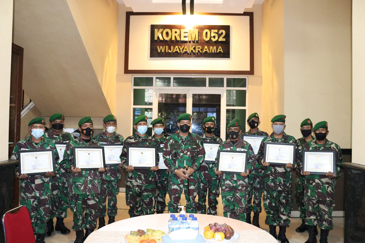 Di akhir acara Danrem memberikan ucapan selamat dan memberikan Piagam Penghargaan kepada 12 Prajurit dalam jajaran Korem 052/WKR dari Kodim 0503/JB 3 orang, dari Kodim 0506/TGR 3 orang, dari Kodim 0510/TRS 6 orang.