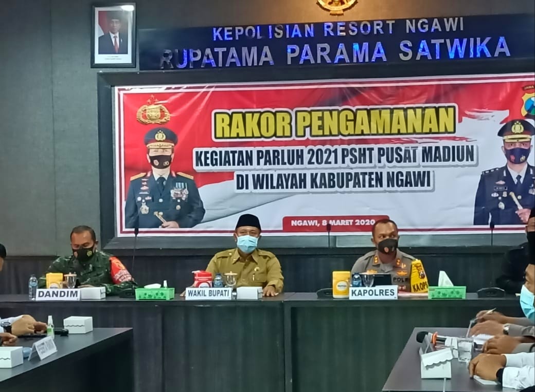 ANGKET24.ID, NGAWI – Untuk menjaga situasi kamtibmas saat kegiatan Parapatan Luhur Persaudaraan Setia Hati Terate (PSHT), Dandim 0805/Ngawi Letkol Inf Totok Prio Kismanto,S.E., bersama instansi terkait menggelar Rakorpam bertempat di Ruang Rapat Utama Polres Ngawi, Senin (08/03/2021).