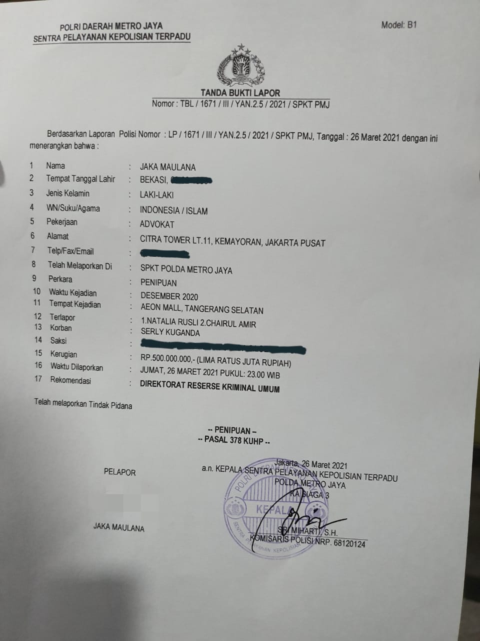 LP No 1671/III/ YAN 2.5 /2021 / SPKT PMJ Tanggal 26 Maret 2021 tertera nama Natalia Rusli dan Chaerul Amir sebagai Terlapor dengan Pasal 378 Penipuan, pelapor Jaka Maulana.