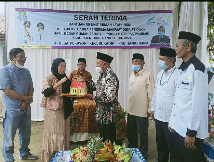 ANGKET24.ID, Kab Tangerang – Pemerintah Kabupaten (Pemkab) Tangerang melalui Dinas Perumahan Permukiman dan Pemakaman (Perkim) Kabupaten Tangerang lewat program Gerakan Rakyat Atasi Kawasan padat, kumuh dan miskin, Stimulan Rehabilitasi Rumah Tidak Layak Huni (BSR2TLH) tahun ini menyerahkan bantuan rumah layak huni kepada 59 warga Kampung Pekayon Desa Pekayon Kecamatan Sukadiri pada Jum’at (12/11/2021).