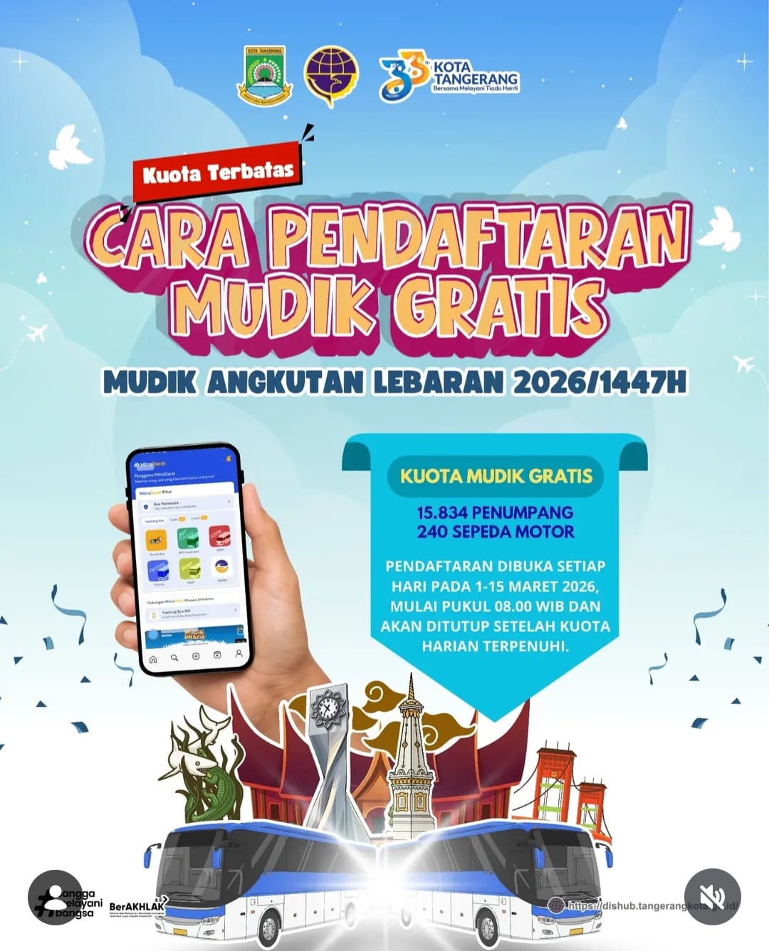 ANGKET24.ID, KOTA TANGERANG – Jelang Hari Raya Idulfitri 1447 Hijriah, Mudik Gratis Mitra Darat Kementerian Perhubungan (Kemenhub) 2026 kembali dibuka dengan kuota 15.834 penumpang termasuk bagi warga Kota Tangerang dan sekitarnya.