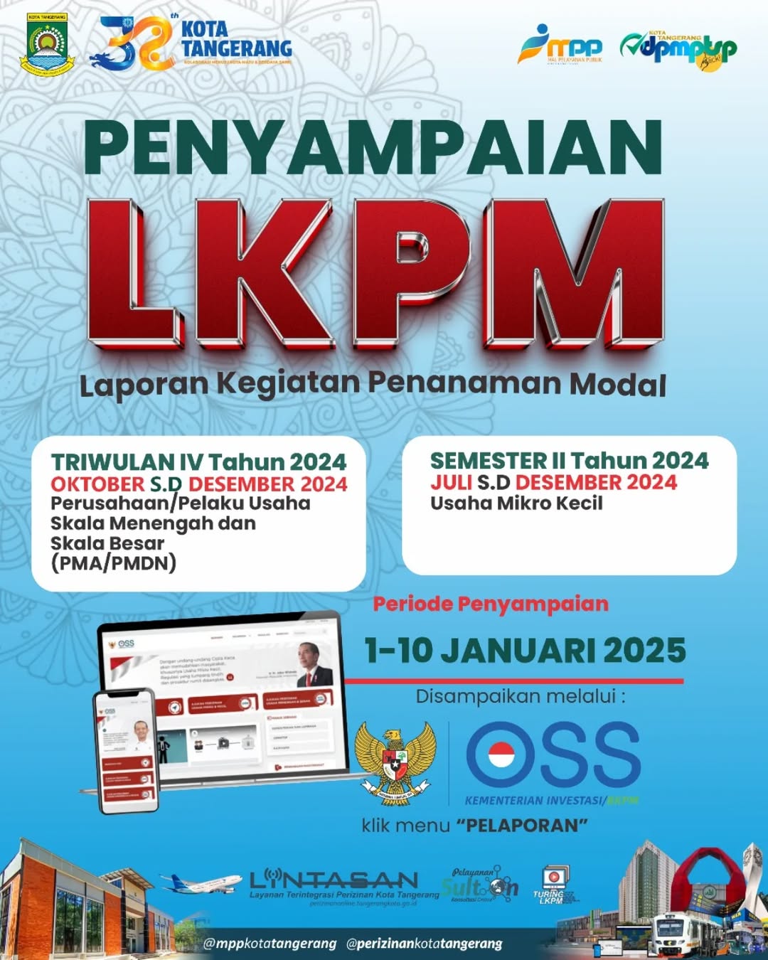 Kepala DPMPTSP Kota Tangerang, Dr. Ir. R. Sugihharto Achmad Bagdja, M.Si, menyatakan bahwa kewajiban pelaporan ini berlaku untuk Penanaman Modal Asing (PMA) dan Penanaman Modal Dalam Negeri (PMDN). Selain itu, pelaporan semester II atau periode Juli–Desember 2024 juga berlaku untuk pelaku Usaha Mikro Kecil (UMK).