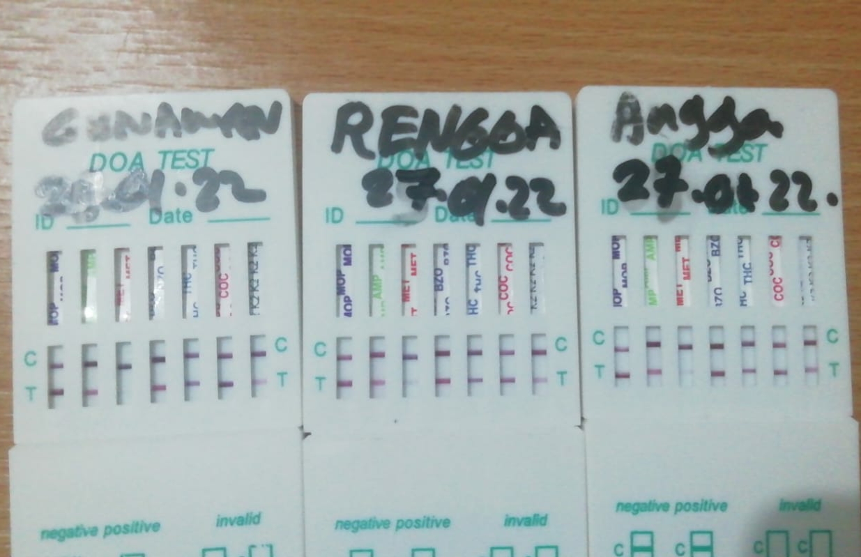 Lebih lanjut Kompol Abdul Rohim melalui tulisan menerangkan, “Rengga Bin Romli (33), Hikmah Angga Pramuka Bin Ahmad Muhara (29) dengan barang bukti 3 (tiga) Buah teskit Hasil Cek Urine,” katanya.