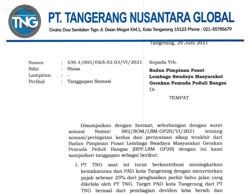 ANGKET24.ID, KOTA TANGERANG– Pasca mendapat surat Somasi dari Gerakan Pemuda Peduli Bangsa (GP2B) dengan no 002/Som/LSM-GP2B/VI/2021, PT Tangerang NUsantara Global memberi jawaban dengan surat tanggapan dengan nomor 539.4/005/EKS-2.03/VI/2021 tanggal 29/6/2021.