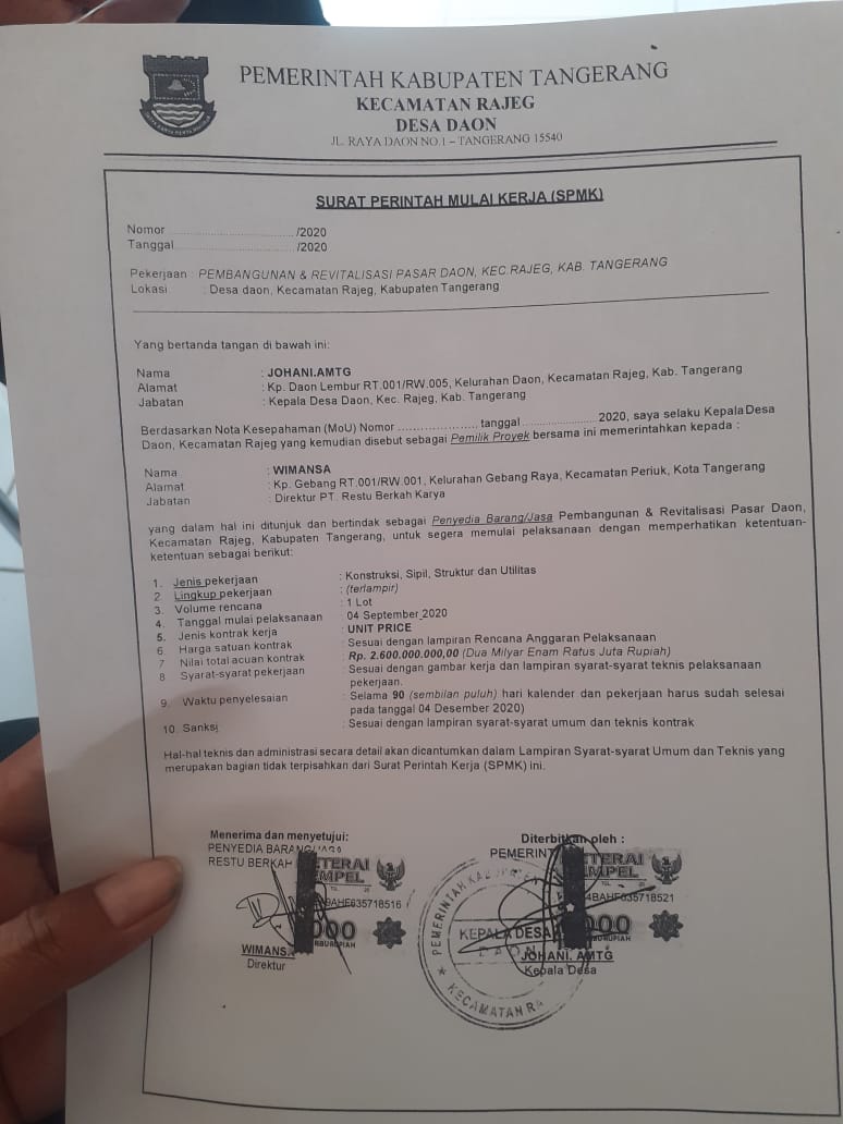 Johani Pengelola pasar Daon saat di temui Wakil ketua Jurnalis Tangerang Raya (JTR) di ruang kerjanya menjelaskan, “sesuai dengan SPK yang di tanda tangani pada tanggal 18/10/2020 dan pekerjaan akan selesai selama 90 hari,dengan nilai kontrak Rp.2.600.000.000,- (Dua milyar enam ratus juta rupiah) ujarnya.