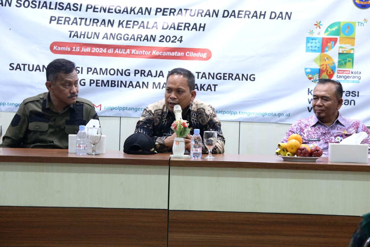 ANGKET24.ID, KOTA TANGERANG – Penjabat (Pj) Wali Kota Tangerang, Dr. Nurdin, berikan arahan kepada para ketua RW dan RT yang berada di wilayah Kecamatan Ciledug, dalam acara Sosialisasi Penegakan Peraturan Daerah (Perda) dan Peraturan Wali Kota (Perwal) Tangerang yang diselenggarakan oleh Satuan Polisi Pamong Praja (Satpol PP) Kota Tangerang, di Aula Kantor Kecamatan Ciledug, Kamis (18/7/24).