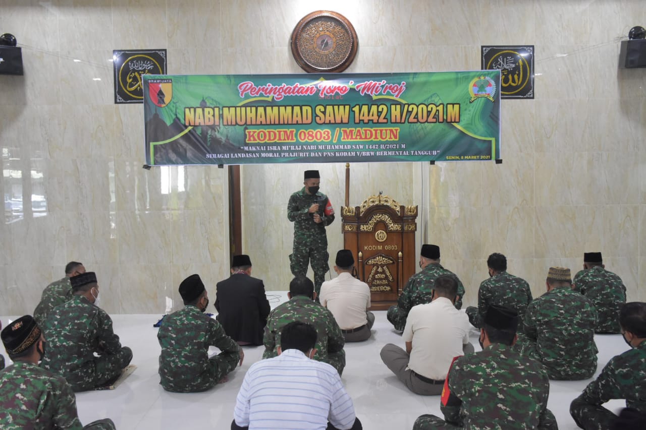Dengan tema “maknai isra mi’raj Nabi Muhammad SAW 1442 H/2021 M sebagai landasan moral Prajurit dan PNS Kodam V/Brw bermental tangguh”, peringatan isra’ mi’raj digelar di Masjid Al – Mujahidin Kodim 0803/Madiun.