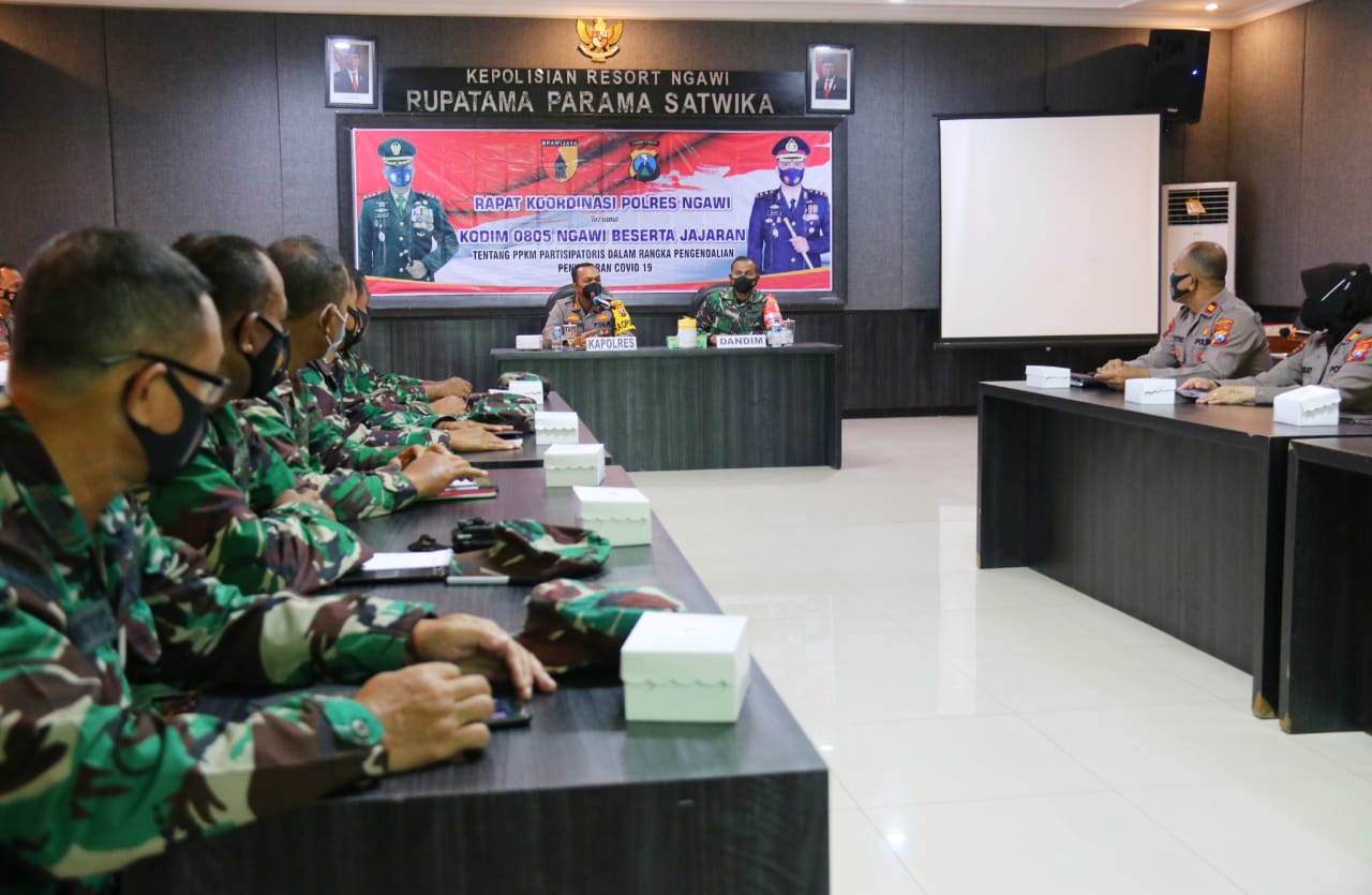 Kapolres Ngawi AKBP I Wayan Winaya menyampaikan bahwa tujuan dari di gelarnya rapat koordinasi ini adalah untuk menyamakan persepsi antara TNI dan Polri dalam hal ini Kodim 0805/Ngawi dan Polres Ngawi tentang penanganan pemberlakuan pembatasan kegiatan masyarakat.