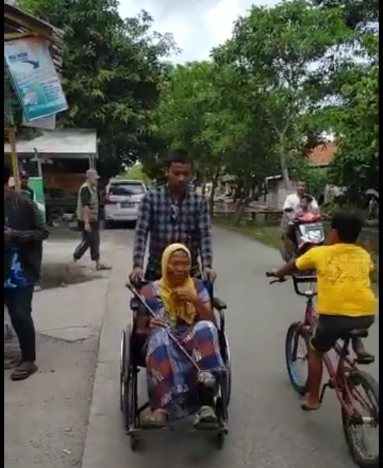 Kursi roda tersebut selanjutnya akan diberikan kepada ibu Ma’ani (65) warga RT03/RW01 yang menderita disabilitas. Ketua Komunitas Teman Akrab Ruben menerangkan, bahwa kegiatan ini berawal dari rasa kepedulian kami terhadap sesama. ” Kita mendapatkan informasi dari Bang Obo serta Kepala Desa bahwa ada salah satu warganya yang menderita disabilitas dan membutuhkan kursi roda. Karena itu hati ini kita antarkan kursi roda tersebut berikut dengan tongkatnya juga,” terang Ruben di lokasi penyerahan.