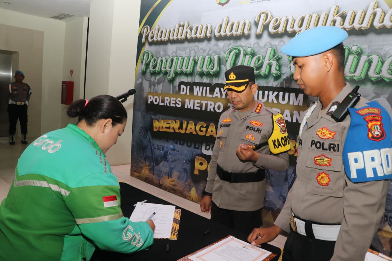 ANGKET24.ID, KOTA TANGERANG – Polres Metro Tangerang Kota resmi melantik dan mengukuhkan kepengurusan komunitas Ojek Online (Ojol) Kota Tangerang, Selasa (23/9/2025) pagi. Kegiatan dipimpin langsung Kapolres Metro Tangerang Kota, Kombes Pol Dr. Raden Muhammad Jauhari, S.H., S.I.K., M.Si., bertempat di Lobby Polres Metro Tangerang Kota, Jalan Perintis Kemerdekaan.
