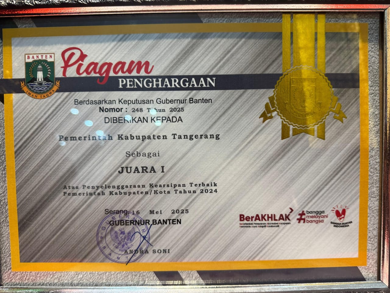 “Alhamdulillah, penghargaan ini merupakan buah dari kerja keras dan komitmen seluruh perangkat daerah dalam menjaga tertib arsip. Prestasi ini menjadi bukti nyata bahwa Kabupaten Tangerang mampu menghadirkan tata kelola arsip yang profesional, transparan, dan akuntabel. Arsip bukan hanya dokumen, tetapi juga memori kolektif daerah yang memiliki nilai strategis dalam mendukung pembangunan serta memberikan pelayanan publik yang lebih baik,” ujarnya.