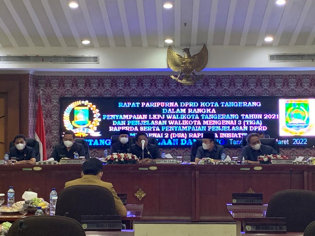 ANGKET24.ID, TANGERANG—DPRD Kota Tangerang, menggelar rapat paripurna, Senin (21/03/2022) di Ruang Paripurna DPRD Kota Tangerang, dengan agenda Penyampaian LKPj Wali Kota Tangerang TA 2021 serta pengajuan lima Raperda di mana dua diantaranya adalah Raperda inisiatif diikuti secara luring dan daring.
