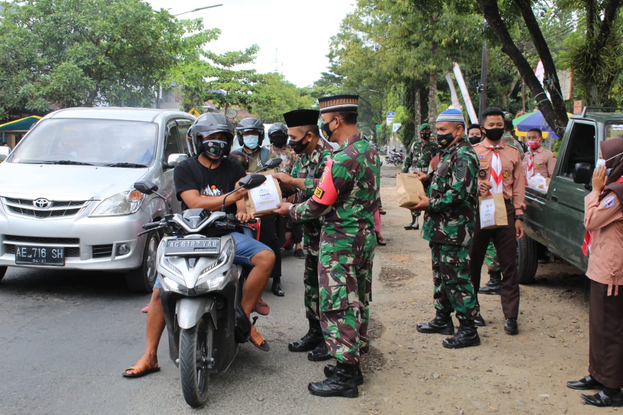 ANGKET24.ID, TRENGGALEK – Pramuka Saka Wira Kartika Kodim 0806/Trenggalek membagikan takjil gratis untuk para pengendara kendaraan yang melintas di jalan Ponorogo – Trenggalek KM. 03, tepatnya di perempatan Lampu Merah Desa Buluagung, Kecamatan Karangan, Trenggalek, Jumat (23/4/21).