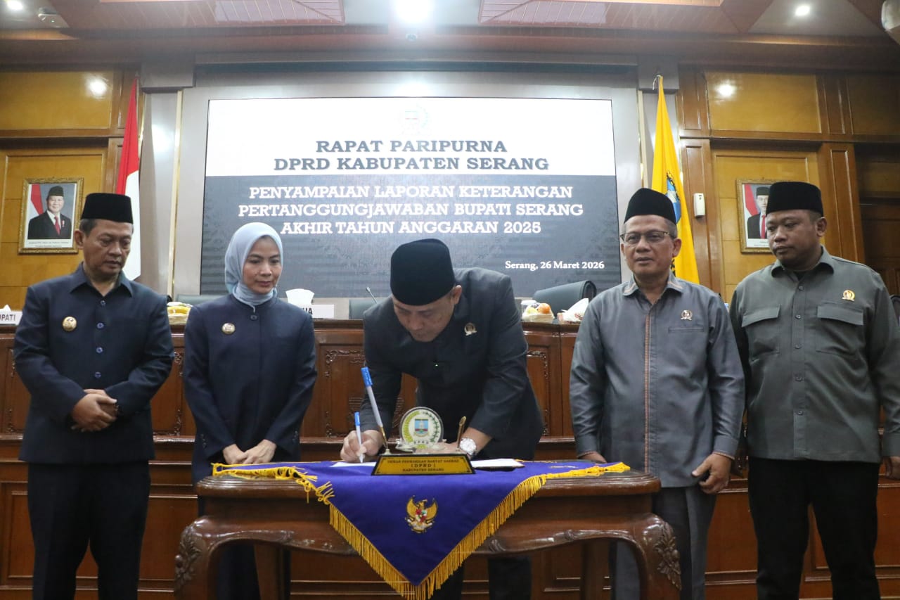 Ketua DPRD Kabupaten Serang Bahrul Ulum mengatakan, berdasarkan apa yang sudah dipaparkan Bupati Serang berkenaan dengan Laporan Keterangan Pertanggungjawaban atau LKPJ Akhir Tahun 2025, selanjutnya akan dibahas di tingkat DPRD selama satu bulan kedepan. (Sudirman)
