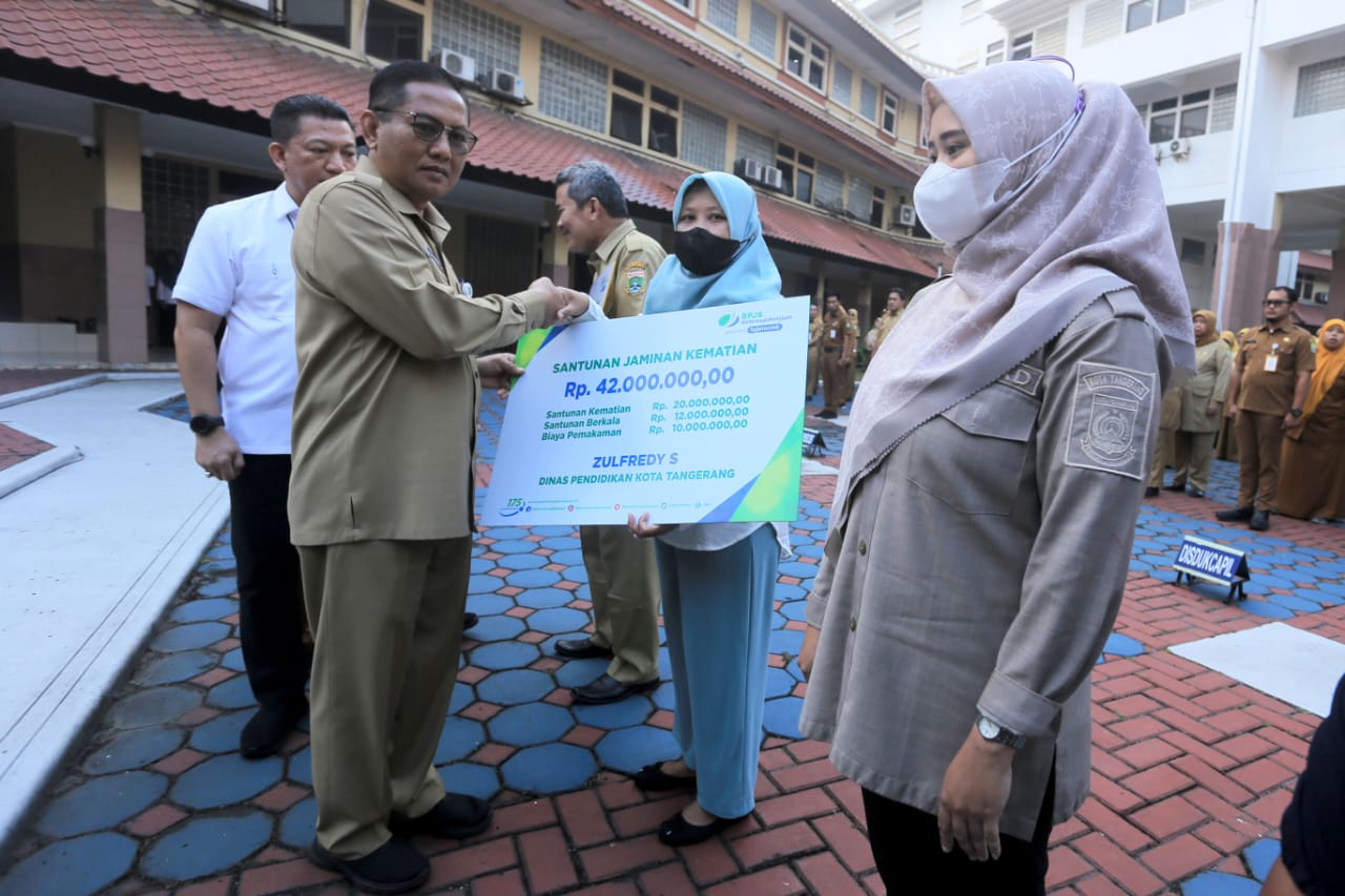 ANGKET24.ID, KOTA TANGERANG – Sekretaris Daerah Kota Tangerang, H. Herman Suwarman, didampingi oleh Asisten Pemerintahan dan Kesejahteraan Rakyat, Deni Koeswara, beserta Kepala BPJS Ketenagakerjaan Cabang Cikokol, Zain Setyadi, menyerahkan secara simbolis santunan jaminan kematian senilai Rp. 42.000.000,- dan jaminan kecelakaan kerja senilai Rp. 1.167.000,- kepada perwakilan keluarga Tenaga Harian Lepas (THL) di Lingkup Pemerintah Kota Tangerang saat apel pagi, Senin (24/07/23).