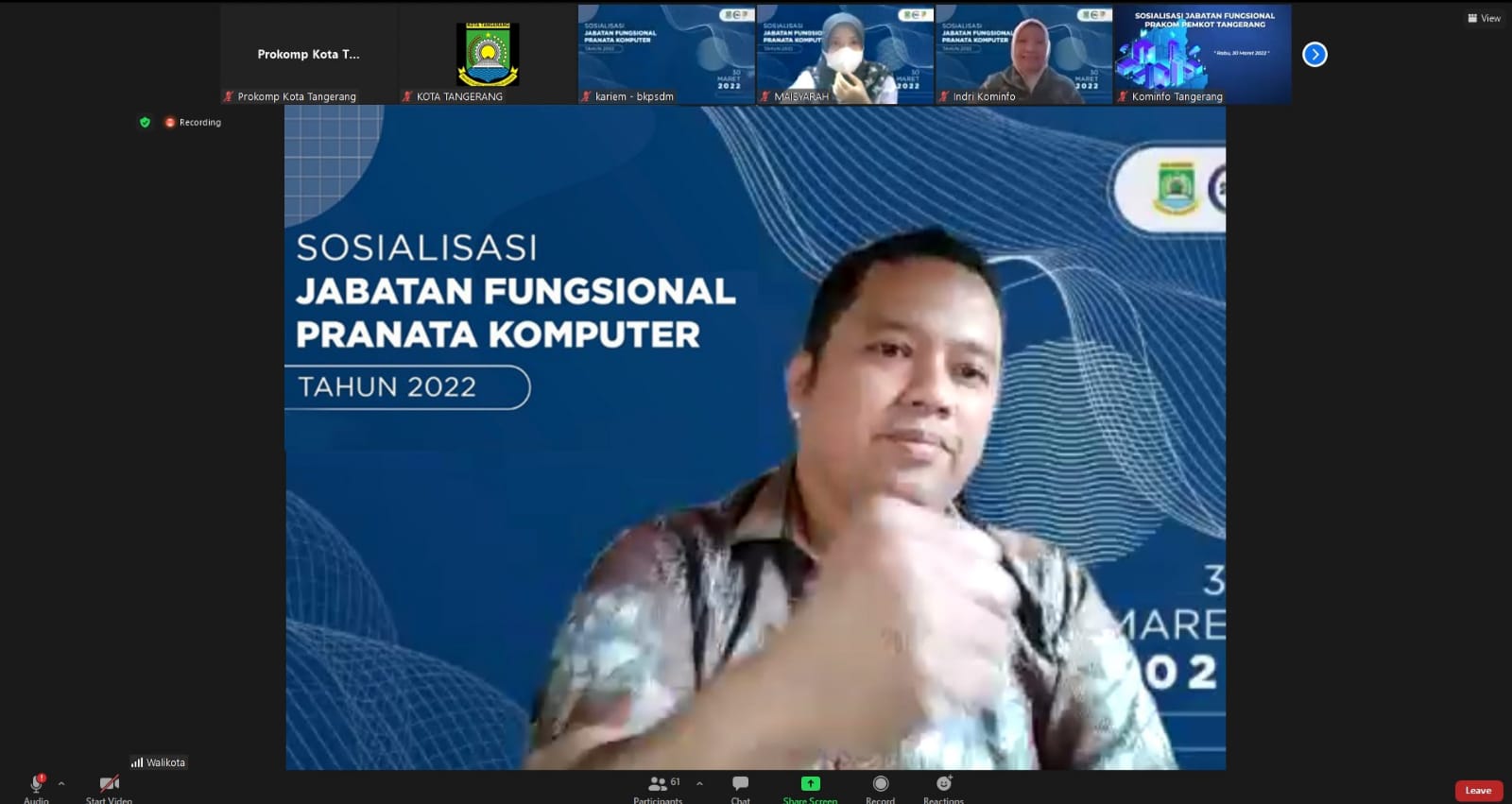 ANGKET24.ID, KOTA TANGERANG –Wali Kota Tangerang H. Arief R. Wismansyah membuka kegiatan Sosialisasi Jabatan Fungsional Tertentu Pranata Komputer di lingkungan Pemerintah Kota Tangerang Tahun 2022 yang diselenggarakan oleh Dinas Komunikasi dan Informatika (Diskominfo) Kota Tangerang secara daring, Rabu (30/03).