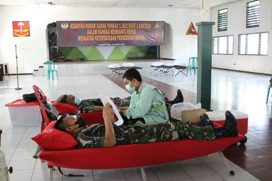 ANGKET24.ID, JAKARTA – Dalam rangka membantu ketersediaan darah RSPAD Gatot Soebroto akibat pandemi Covid – 19, Yonkav 1 Kostrad bersama RSPAD Gatot Soebroto menggelar donor darah di Mayonkav 1 Kostrad Cijantung, Jakarta Timur. Jumat (18/06/2021).